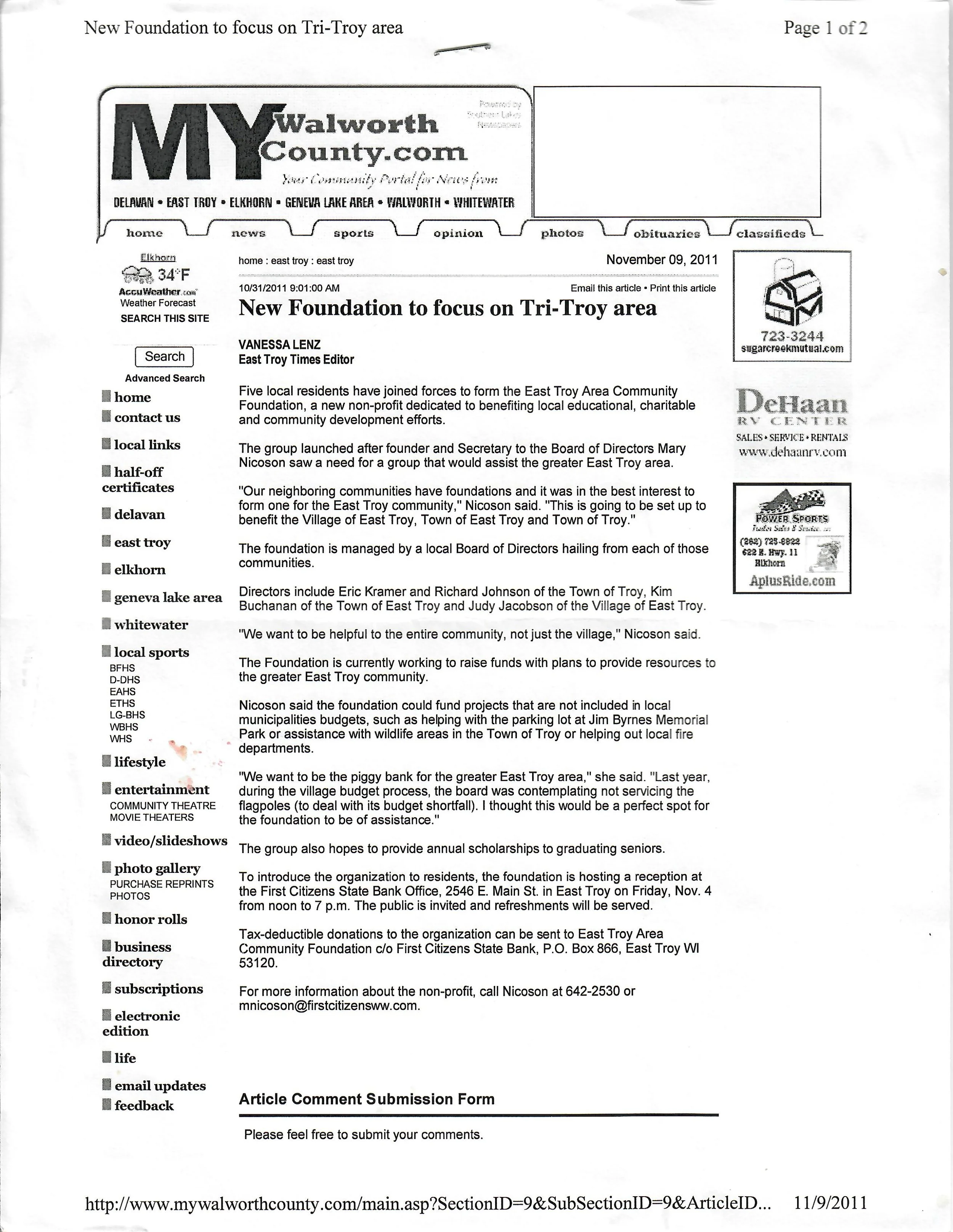 To provide financial support for community projects that benefit the greater East Troy Area.